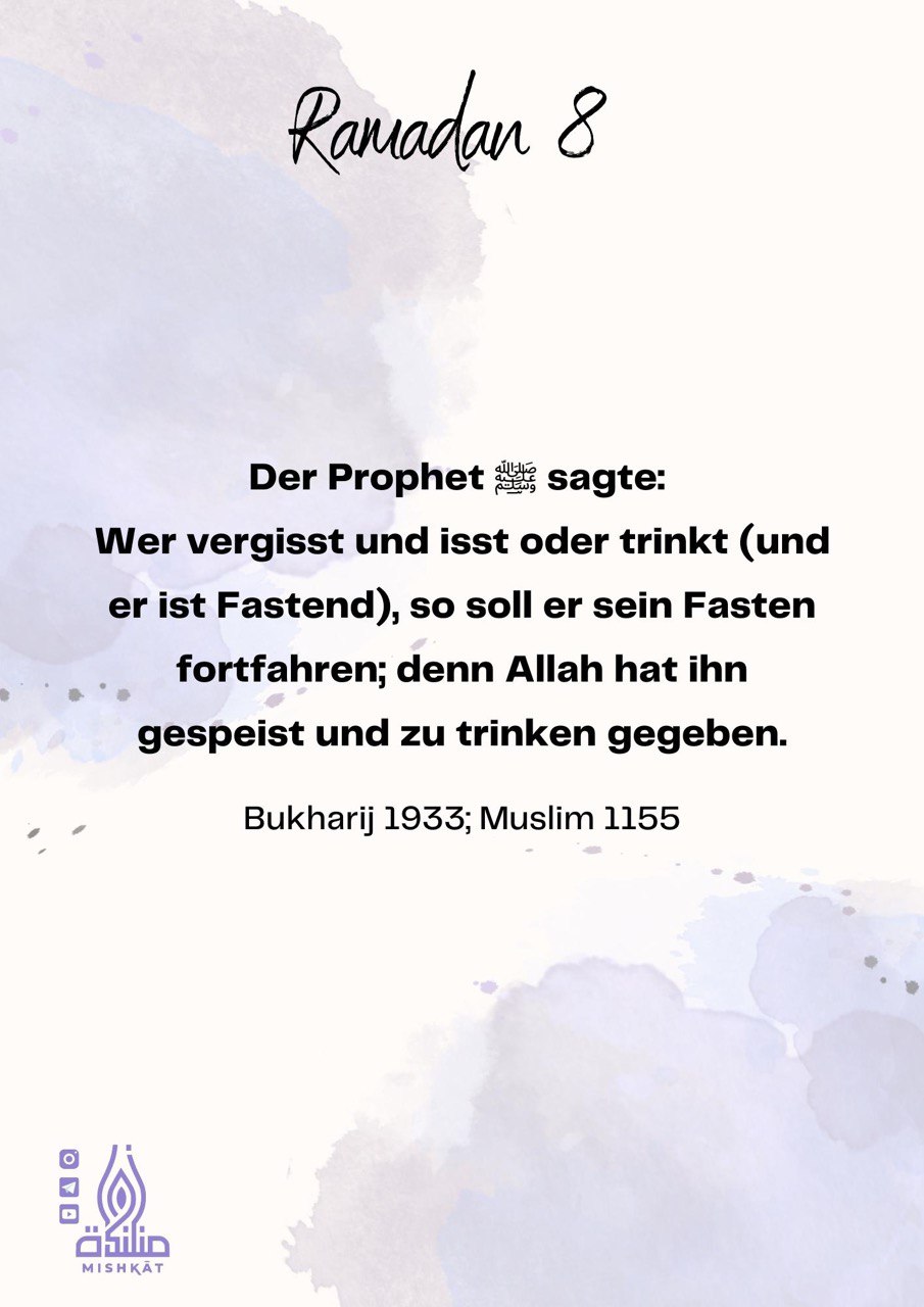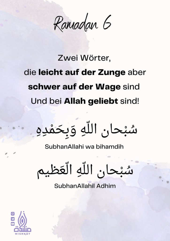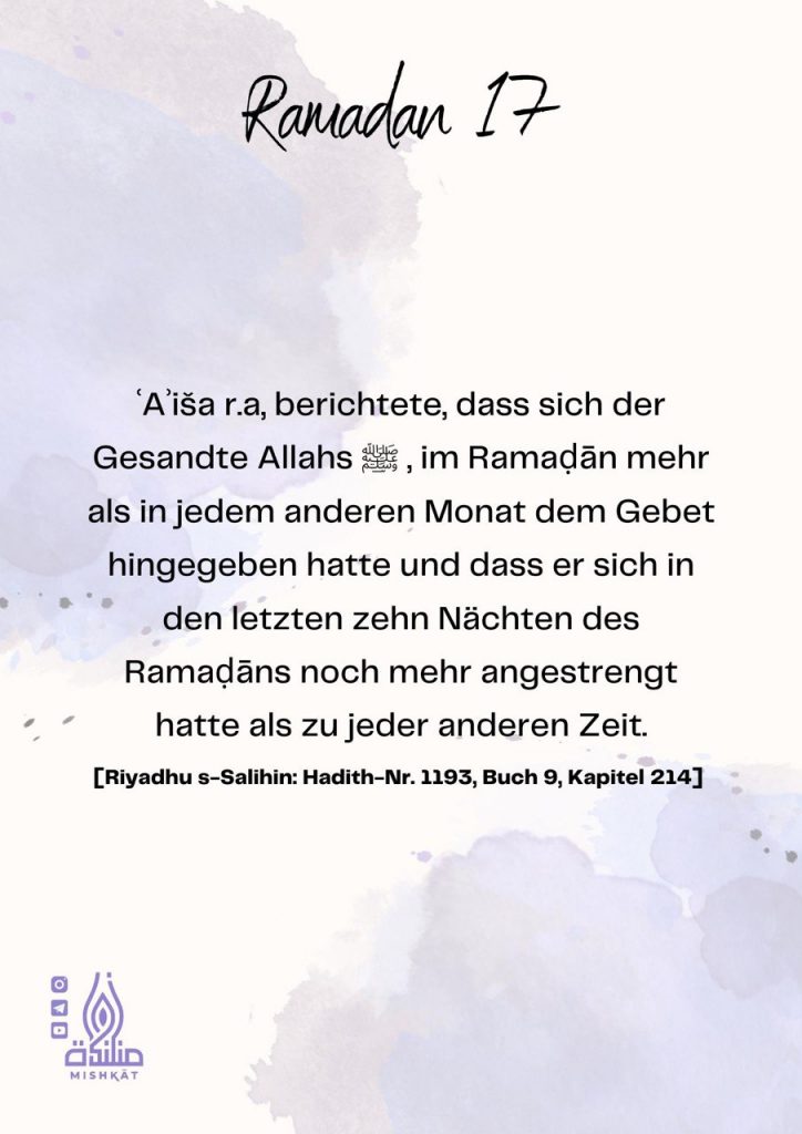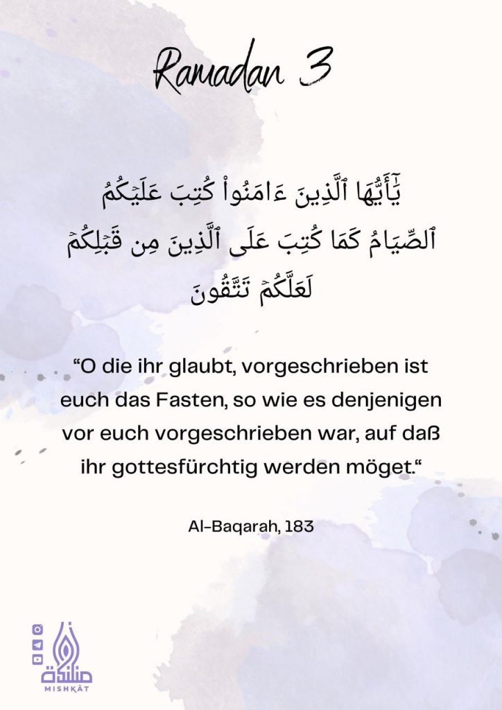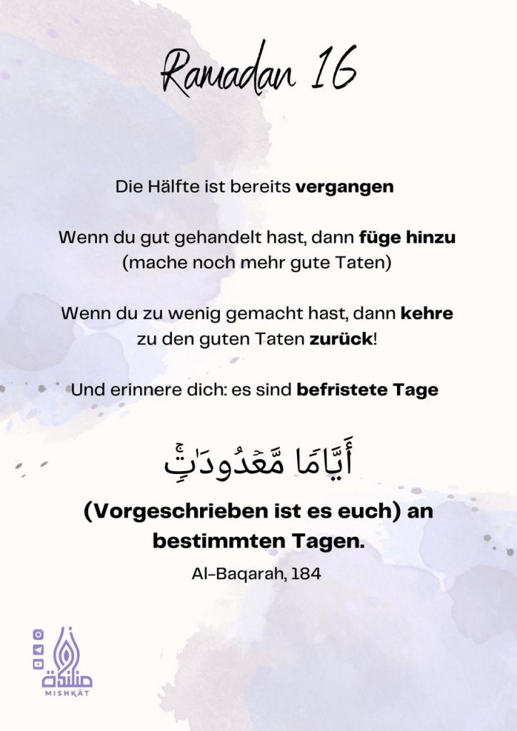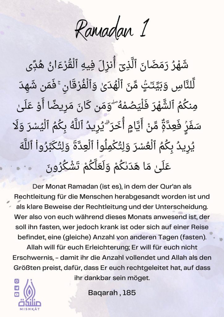 Diese Galerie enthält tägliche Erinnerungen für den Ramadan – Auszüge aus dem Qur’an und der Sunnah, praktische Tipps und inspirierende Gedanken für jeden Tag des Monats. Neben den täglichen Erinnerungen findest du hier weitere Informationen.